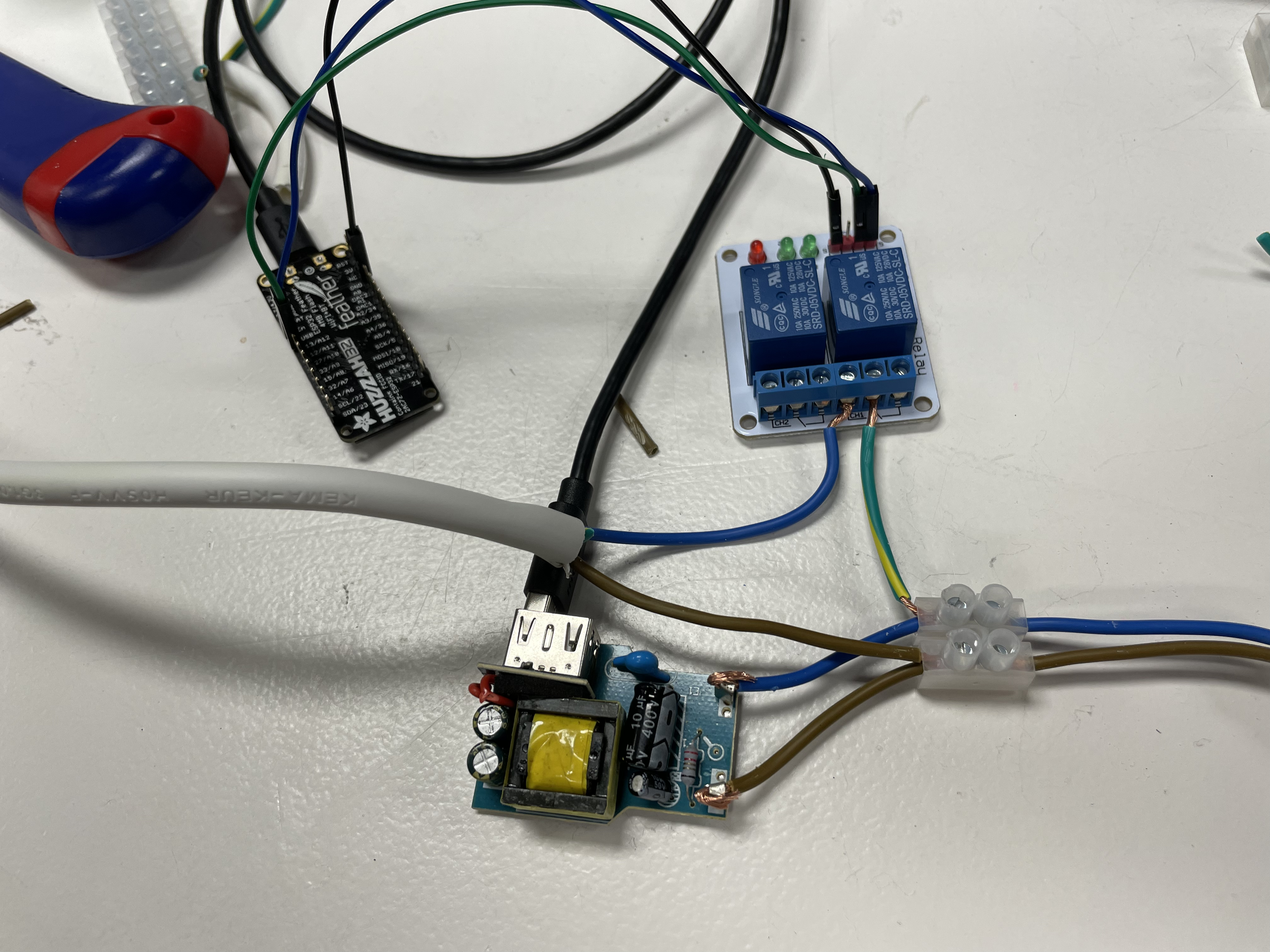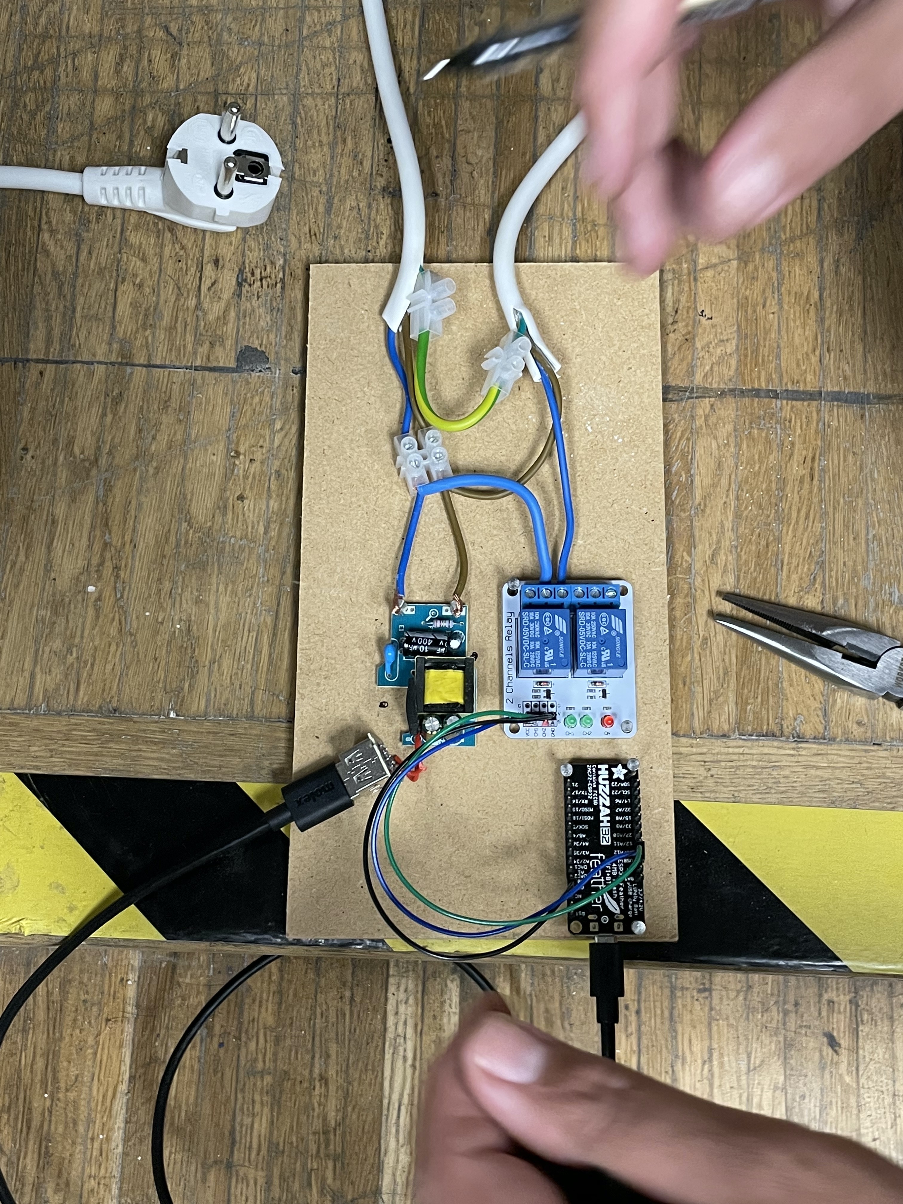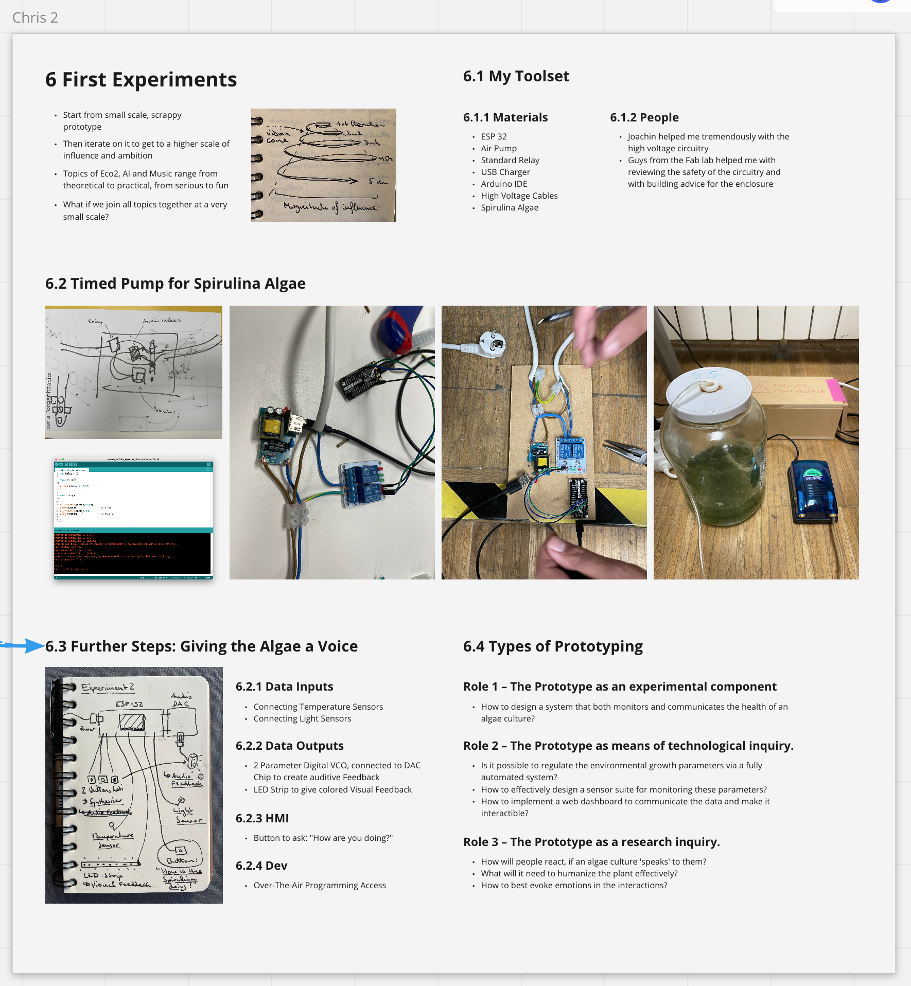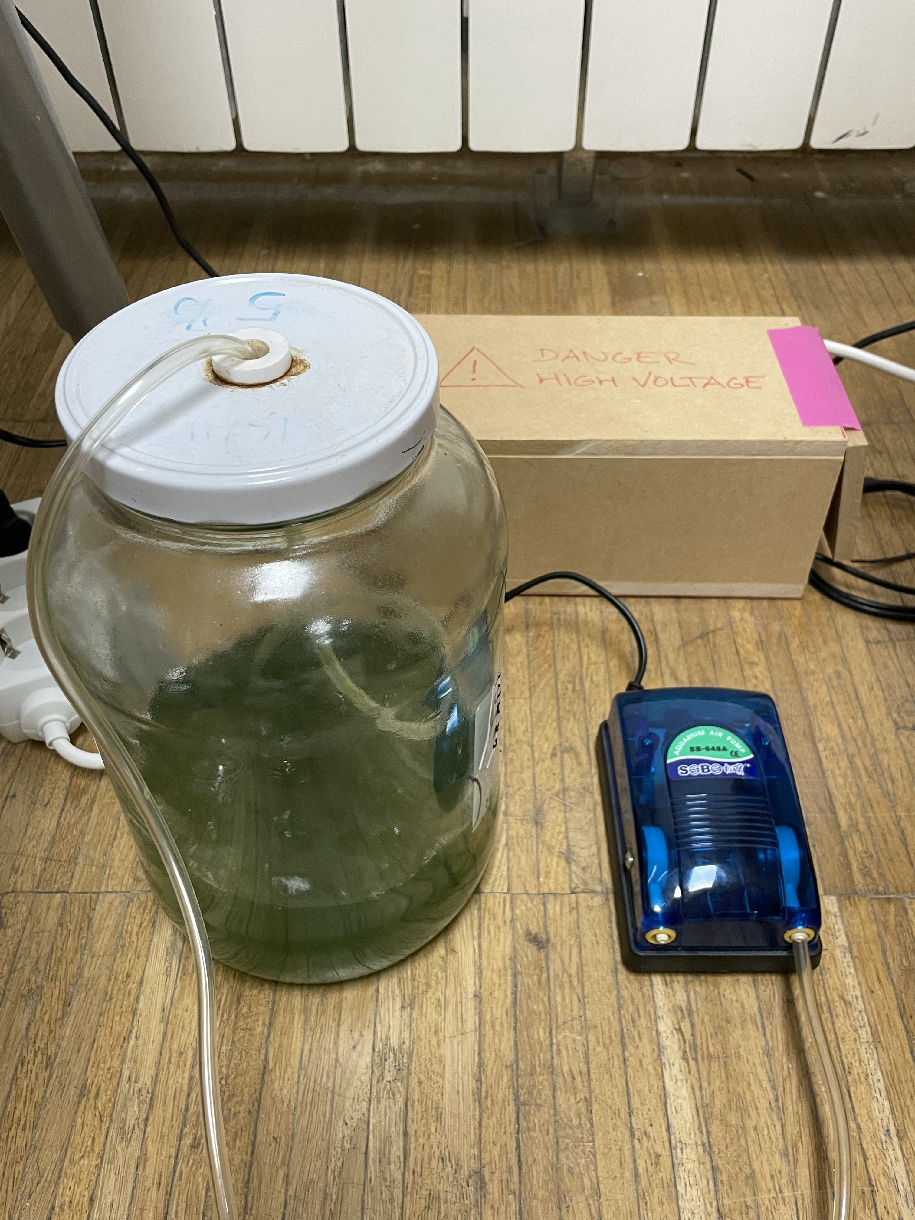 Although conceptually based on my personal design space and the desired professional profile, the idea for my experiment came in a surprisingly accidental and organic manner. In the Bio & Agri Zero seminar, we were introduced to an algae species named Arthrospira (called in the following Spirulina after its edible biomass and for simplicity), which features remarkable qualities as a food supplement, and entrusted with our very own culture to take care of in a five-liter glass jar. Besides light, nutrients and the correct PH-level, this culture needs a steady influx of O2 in it's medium to grow effectively. This happens preferably through a air pump, which should be switched on approximately five minutes every hour. However, the time-switch for our air pump was broken – which meant a slowed growth for the algae at best, the death of the culture at worst. This is how I decided to prototype a time switch for this air pump based on a ESP-32 microprocessor. While the corresponding program was quickly written, assembling the physical high voltage circuitry and building a custom wood enclosure, thus making it safe to run 24/7 without any supervision, took more effort. Below you can find images of the process leading up to and including the final prototype. This pump is now deployed to supply O2 to the algae in our classroom.