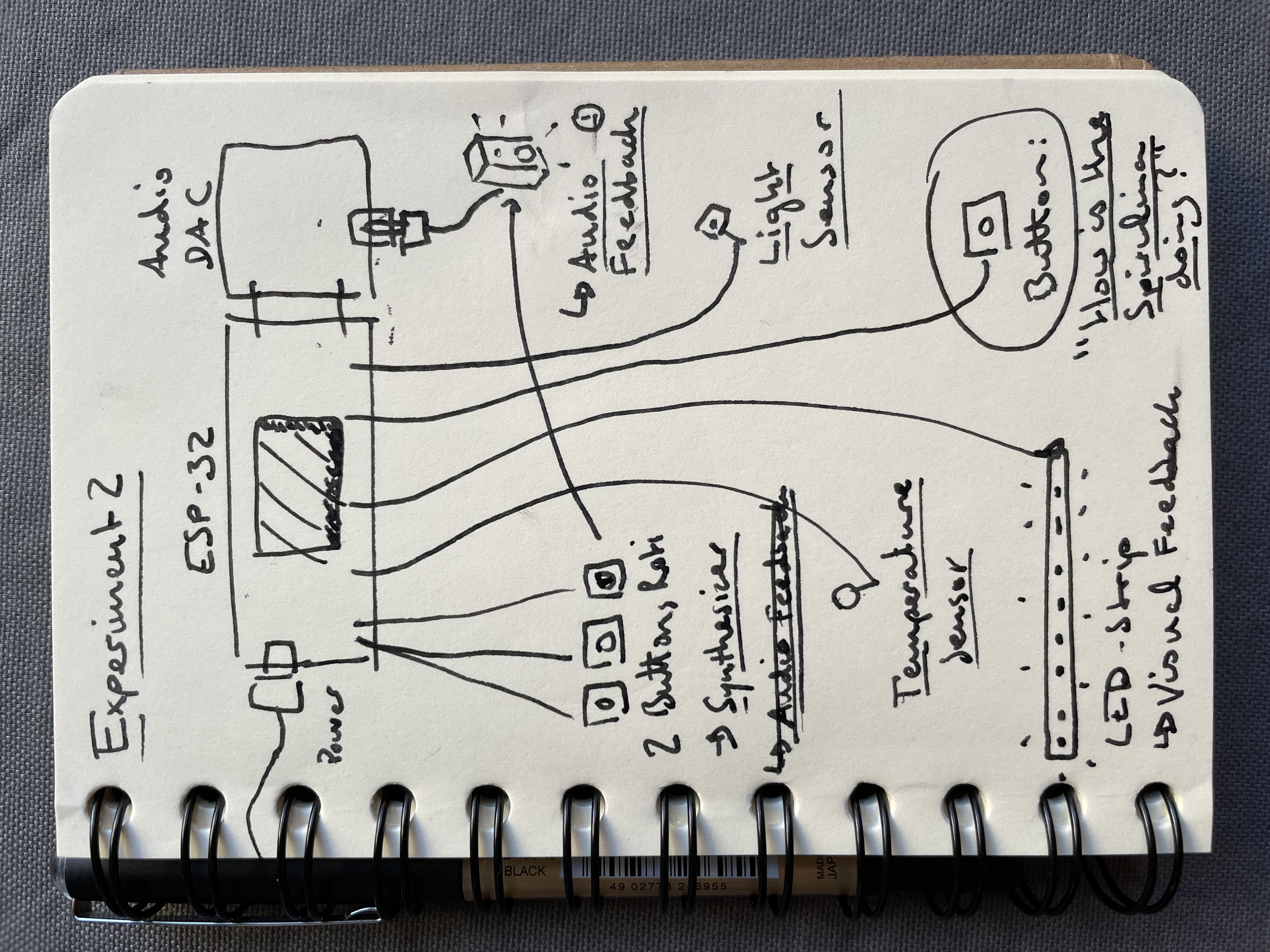 With this prototype done, it serves as a solid base to iterate on: A integrated power supply for the microcontroller, a safe enclose and a access port to connect additional sensors later on and add software updates. To develop this prototype further, I identified a number of individual experiments, for which most of them I have all necessary materials already. These experiments are to be built and executed independently but can be combined at any stage to add onto each other. Piece by piece, this will add up to a integrated sensor suite with audio-visual feedback capabilities. In detail, these experiments include: