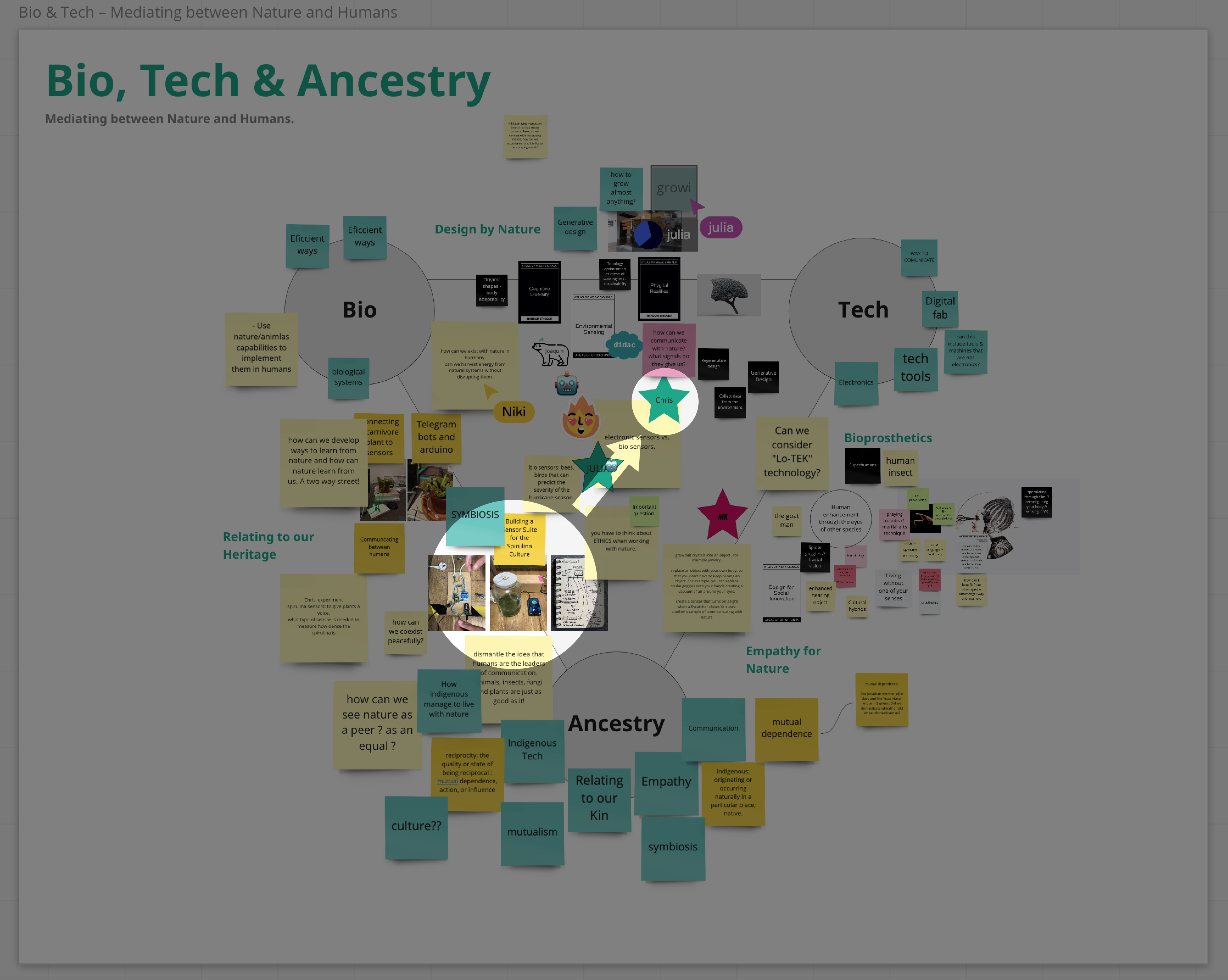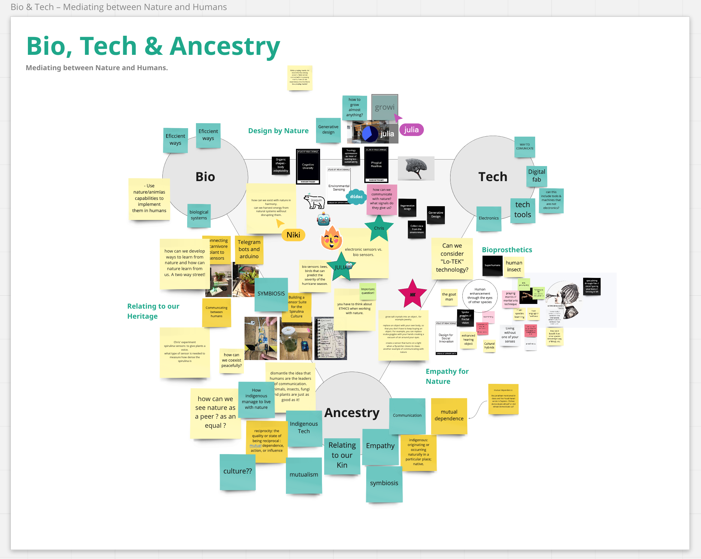 After experimenting individually in the previous week, we moved to refining our collective design spaces with the newly built prototypes. This way, we managed to restructure and sharpen the profile of the design space. In the case of group six (as shown below) it led us to refine the focus to include three big topics: Biology, Technology and Ancestry. These three areas of inquiry can be summarized as the task to mediate between nature and us humans through the means of technology. It also emphasizes the idea that the classification between humans and the rest of our ecological surroundings is arbitrary at best and very harmful at worst. To bridge that gap, to create empathy, to build symbiotic relationships and to foster a greater understanding of our natural kin are some of the goals that conceptually unite the projects within this design space.