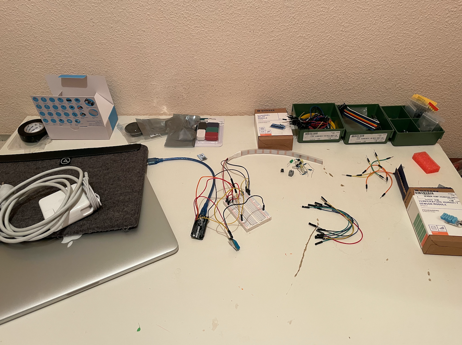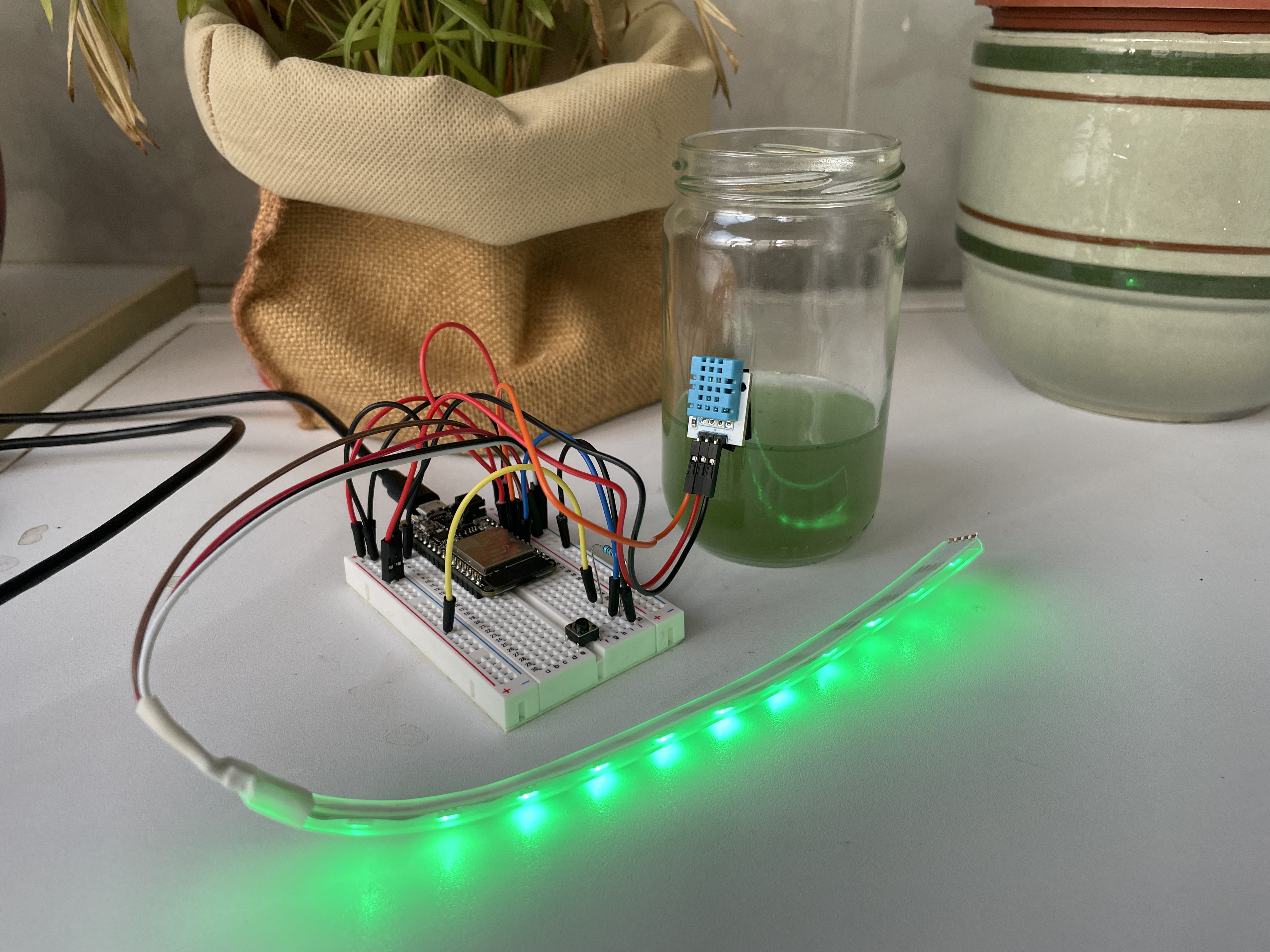After completing the group work, I started working on another proof-of-concept prototype. The goal was to connect a temperature and humidity sensor to the Adafruit ESP32 Feather microcontroller, to read the temperature, to assert if the temperature is within a range favorable to promote Spirulina growth and to finally give a visual feedback via a multi-colored LED strip. Below, in images and videos, the process and outcome is shown. You can find the complete code and all future updates Github.