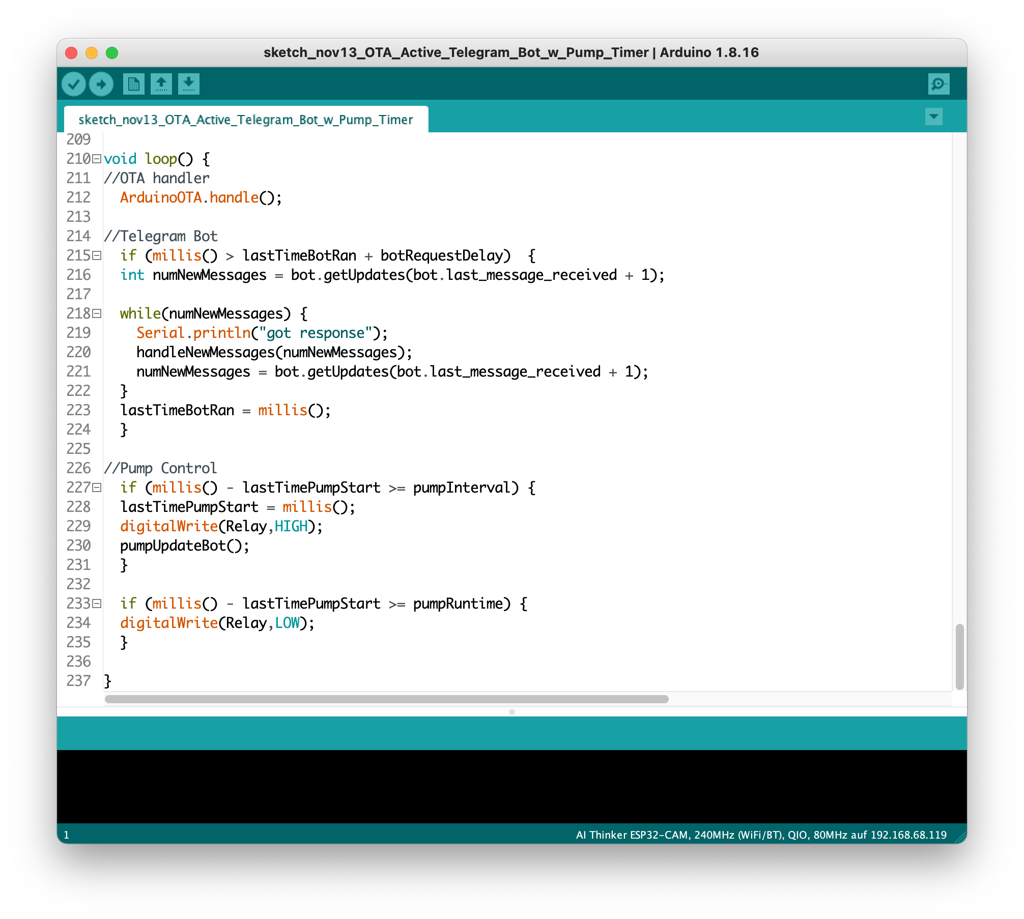 The code itself is a product of many individual small experiments I did over the past eight months. It features a Telegram Bot integration for communicating (both actively and reactively) system status, over-the-air update capabilities and (cooperative) multitasking when executing its functions. The code is made public on Github to work towards a true open-source project.