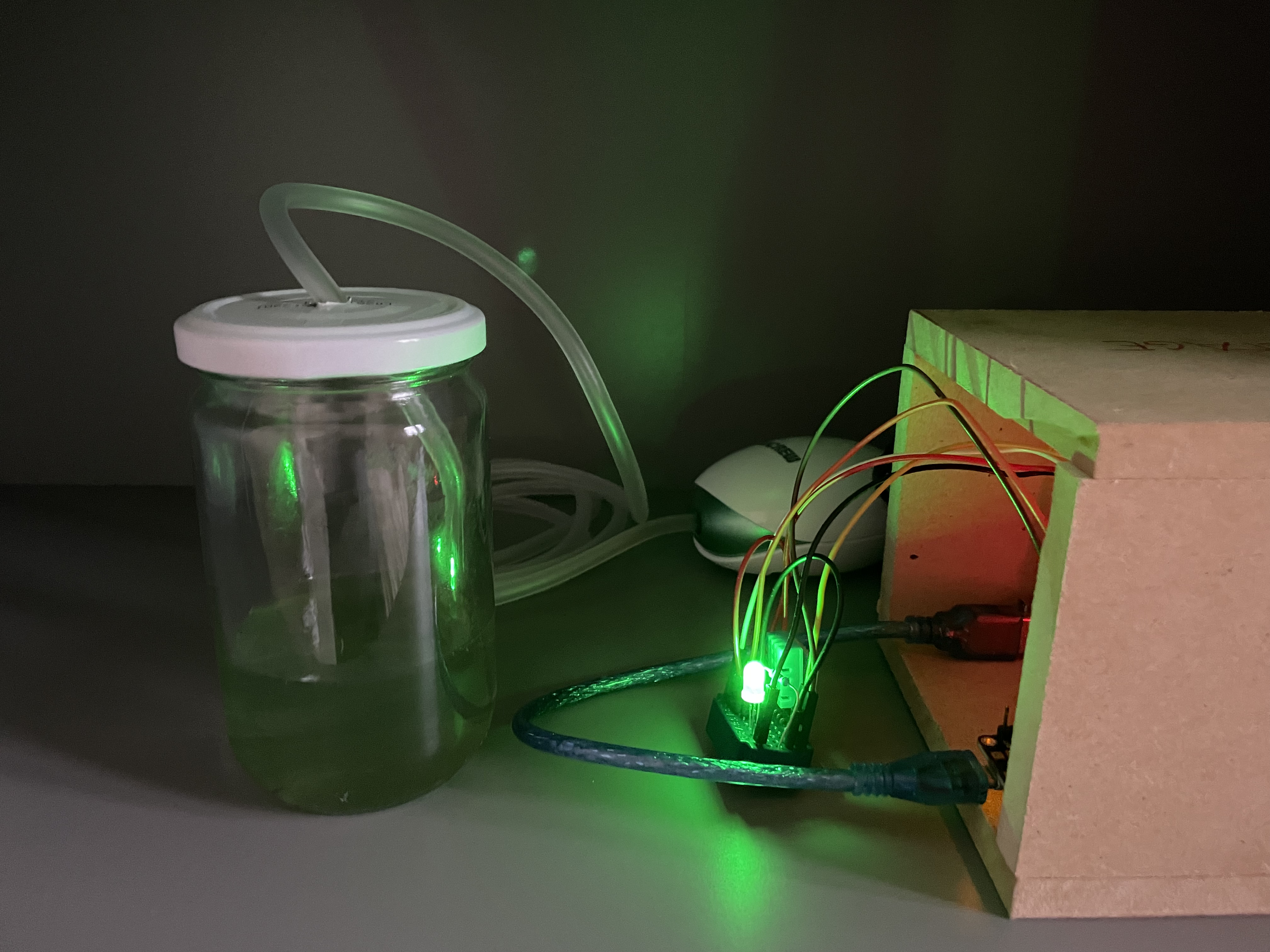With this ongoing project, I was aiming to build a complete sensor suite, monitoring the most crucial growth conditions (light, temperature, aeration), and a microcontroller, regulating these conditions and recording the data into a web-based dashboard. The minimal viable product (short: MVP) would be an implementation of all these things, albeit on a low-tech level. This effort resulted in the first iteration of my Spirulina farming setup, which can be found below. The long-term goal is to open source not only the codebase (found below), but the hardware construction as well, for anyone to copy and build themselves.