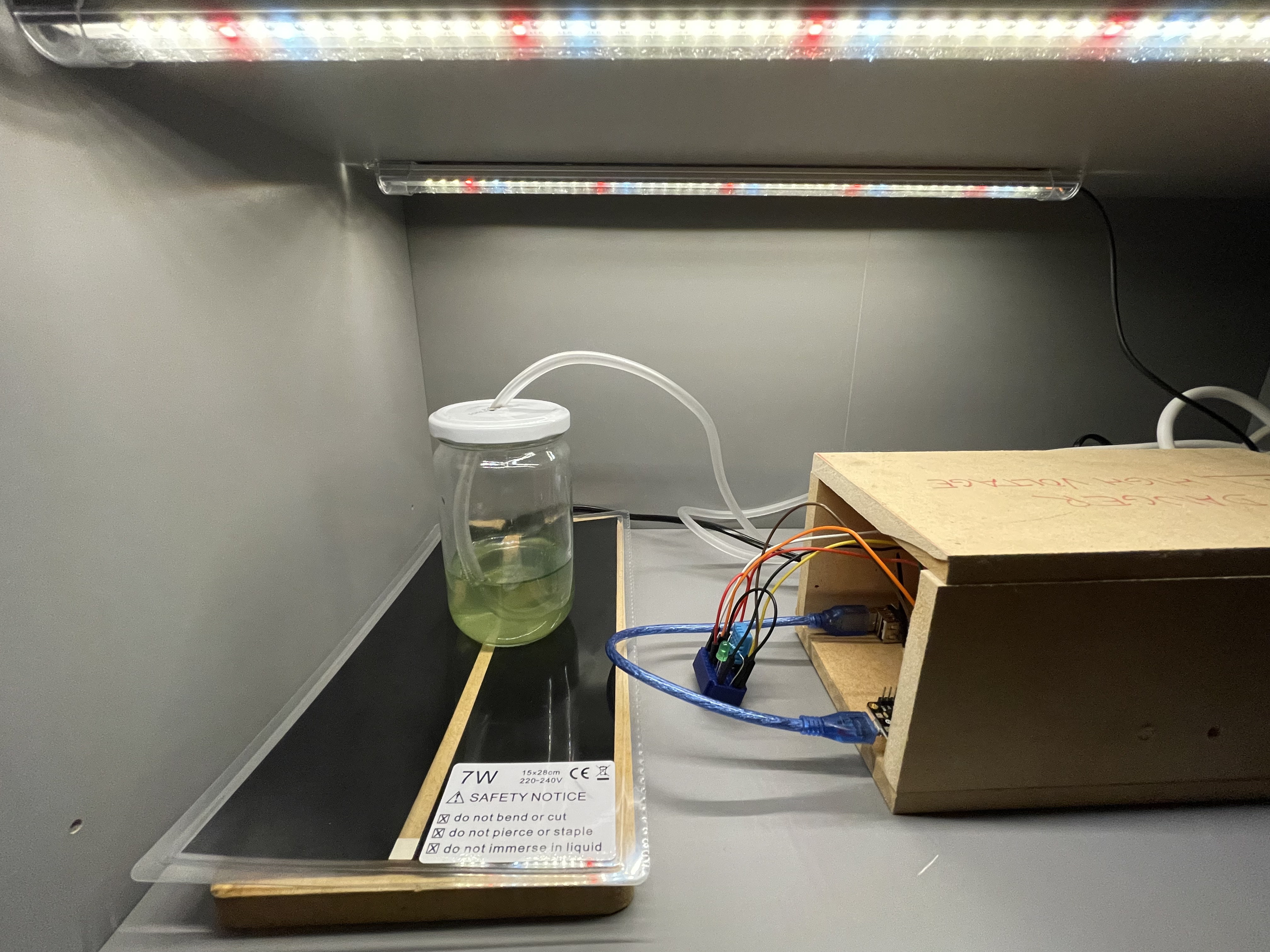 Above, you can see the MVP version of the setup, currently running 24/7. It features a time-controlled air pump, high-powered LED-lights, and heating pad, as well as a temperature sensor and a LED for displaying system status. In the wooden box, there is a relay, controlling the pump 220V output, as well as a ESP32 microcontroller and it's USB 5V power supply. The parts used so far are:
