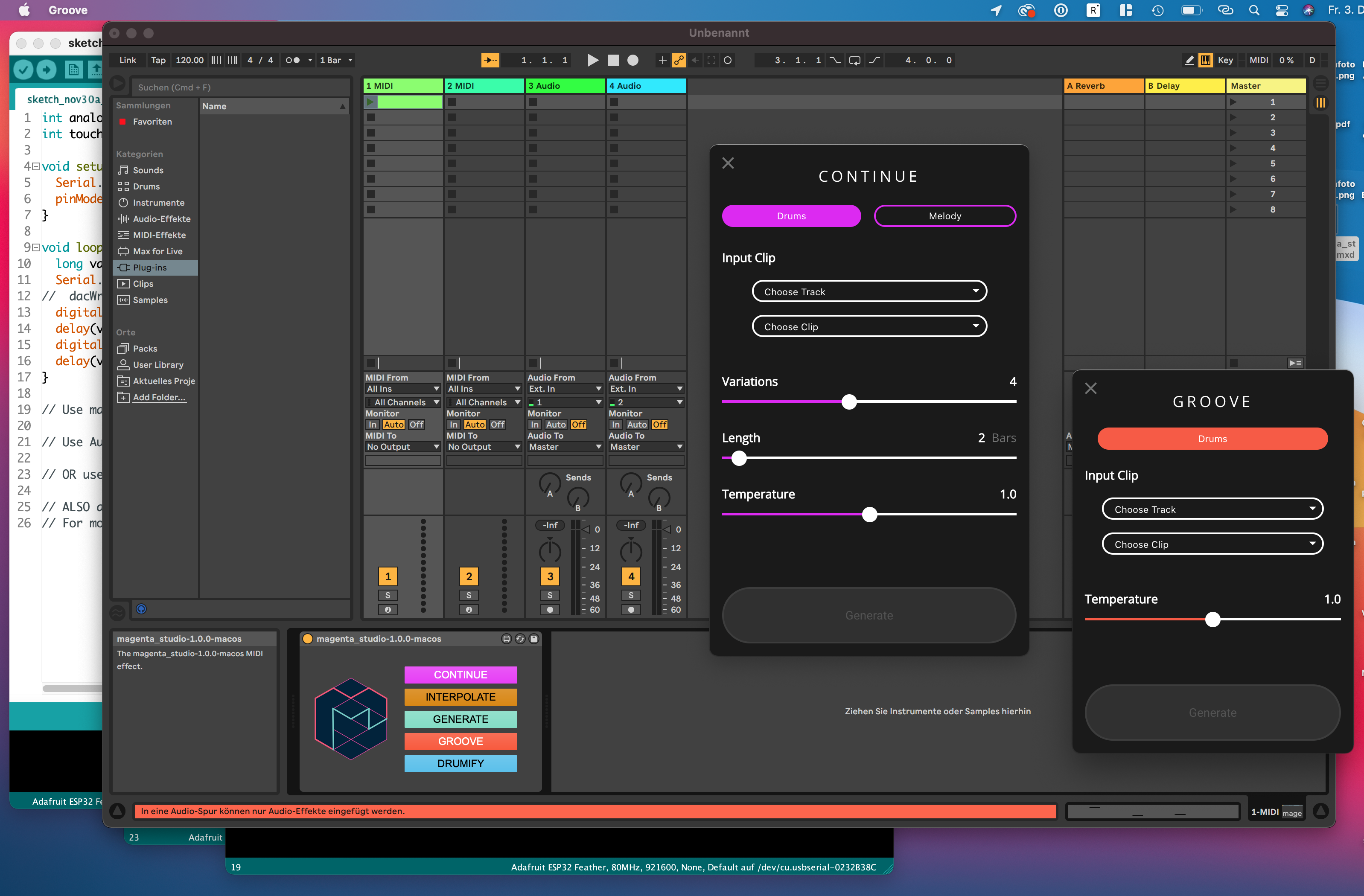 Multiple technology stacks for reading plant conductivity to produce and modulate sounds (left), AI-assisted music plugins by Magenta Labs in Ableton (right).