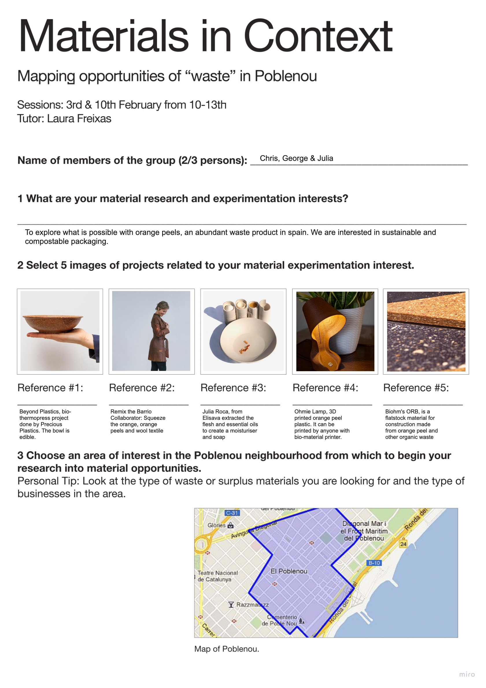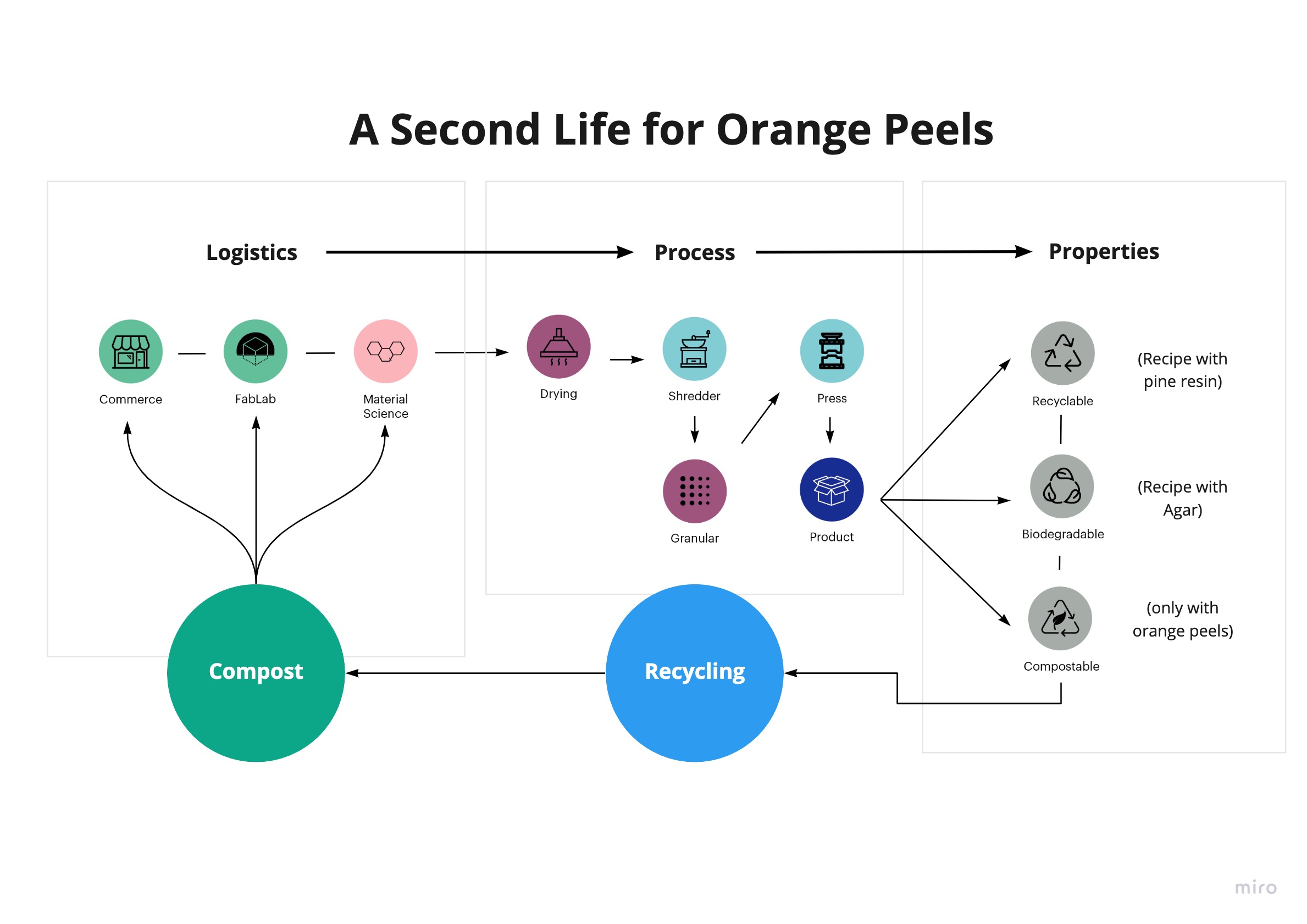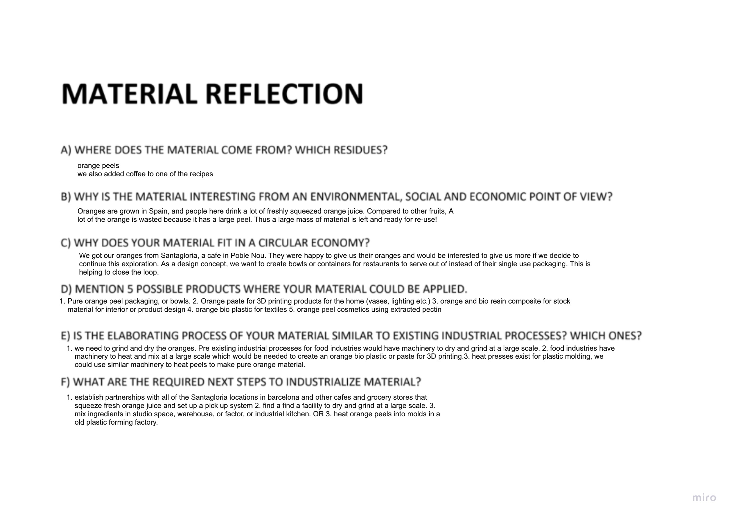 To deeper dive into biomaterials and the potentials they have in combination with community outreach, Laura Freixas introduced us to Remis El Barrio and the principles of creating a circular economy in the neighborhood. In the following two weeks we dove into exploring gathering resources (oranges) from these local stakeholders (small businesses) to manufacture material samples that could further be feasible to be manufactured as plates and bowls for serving food.