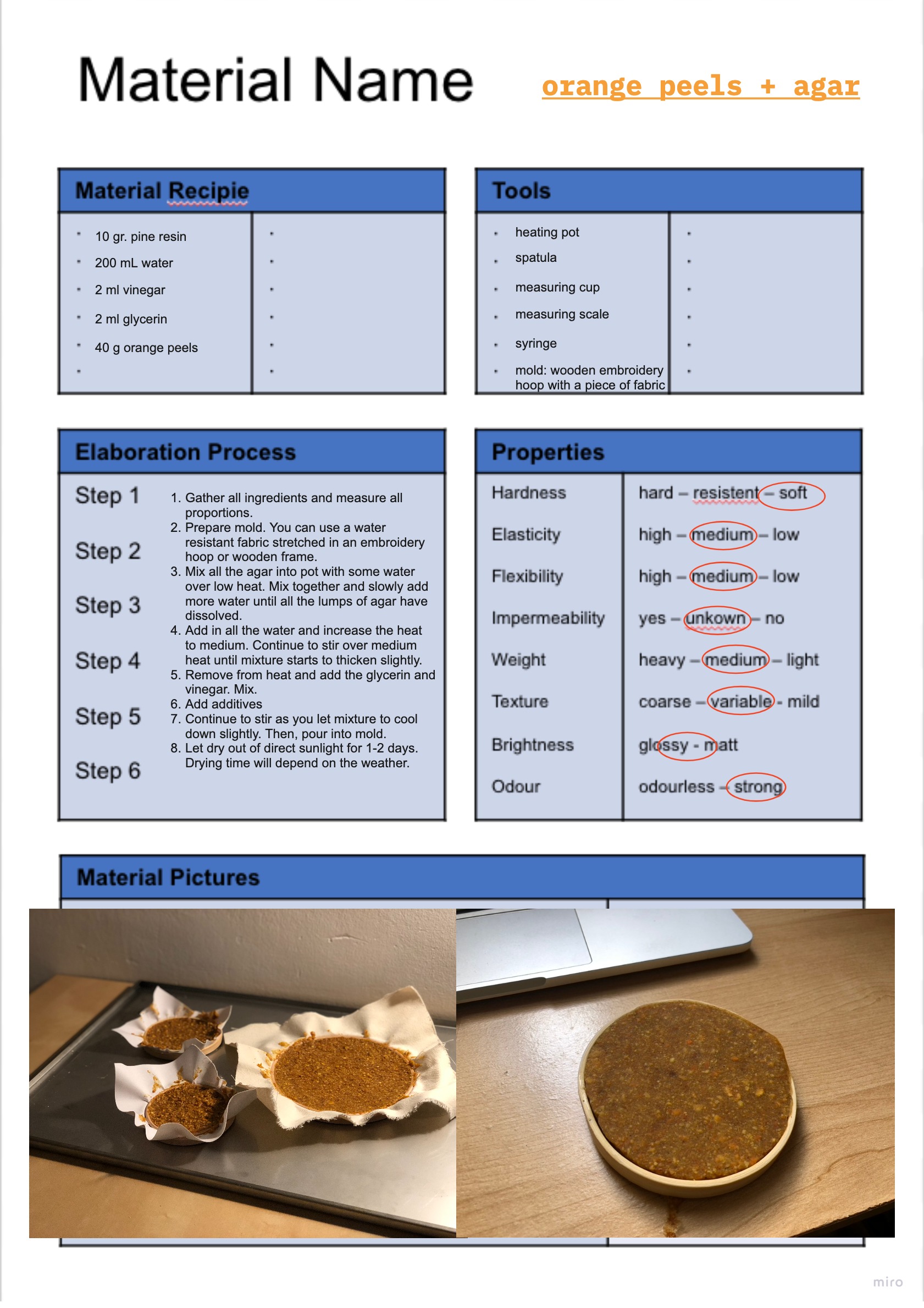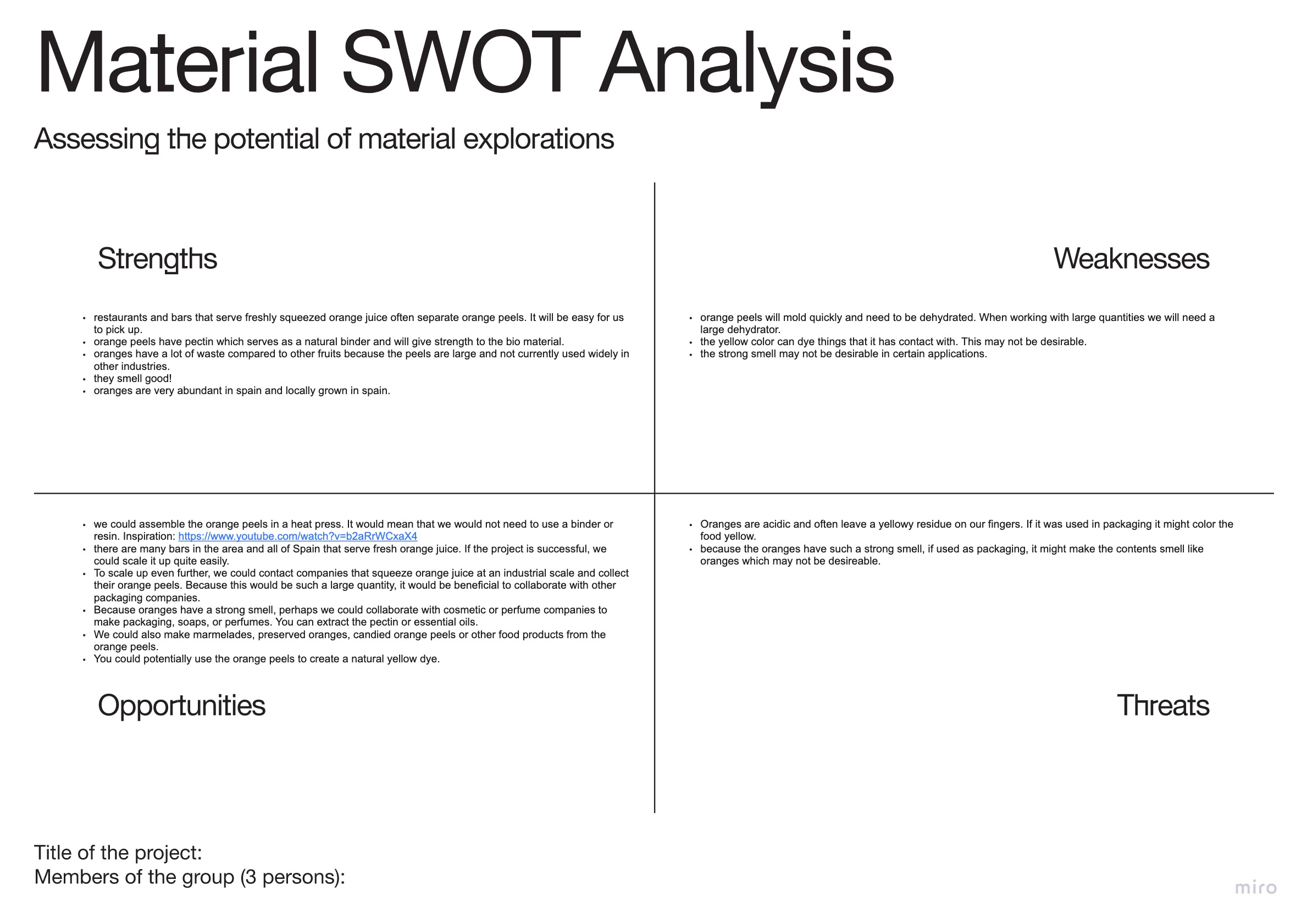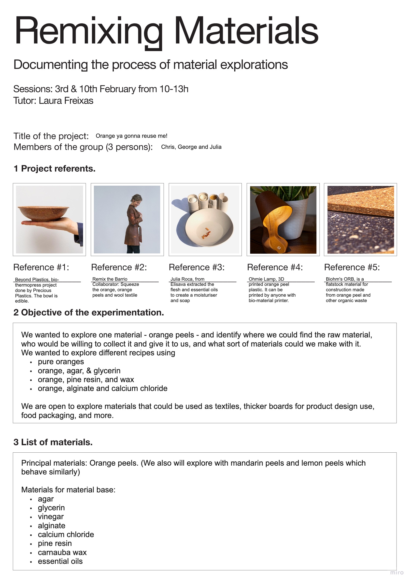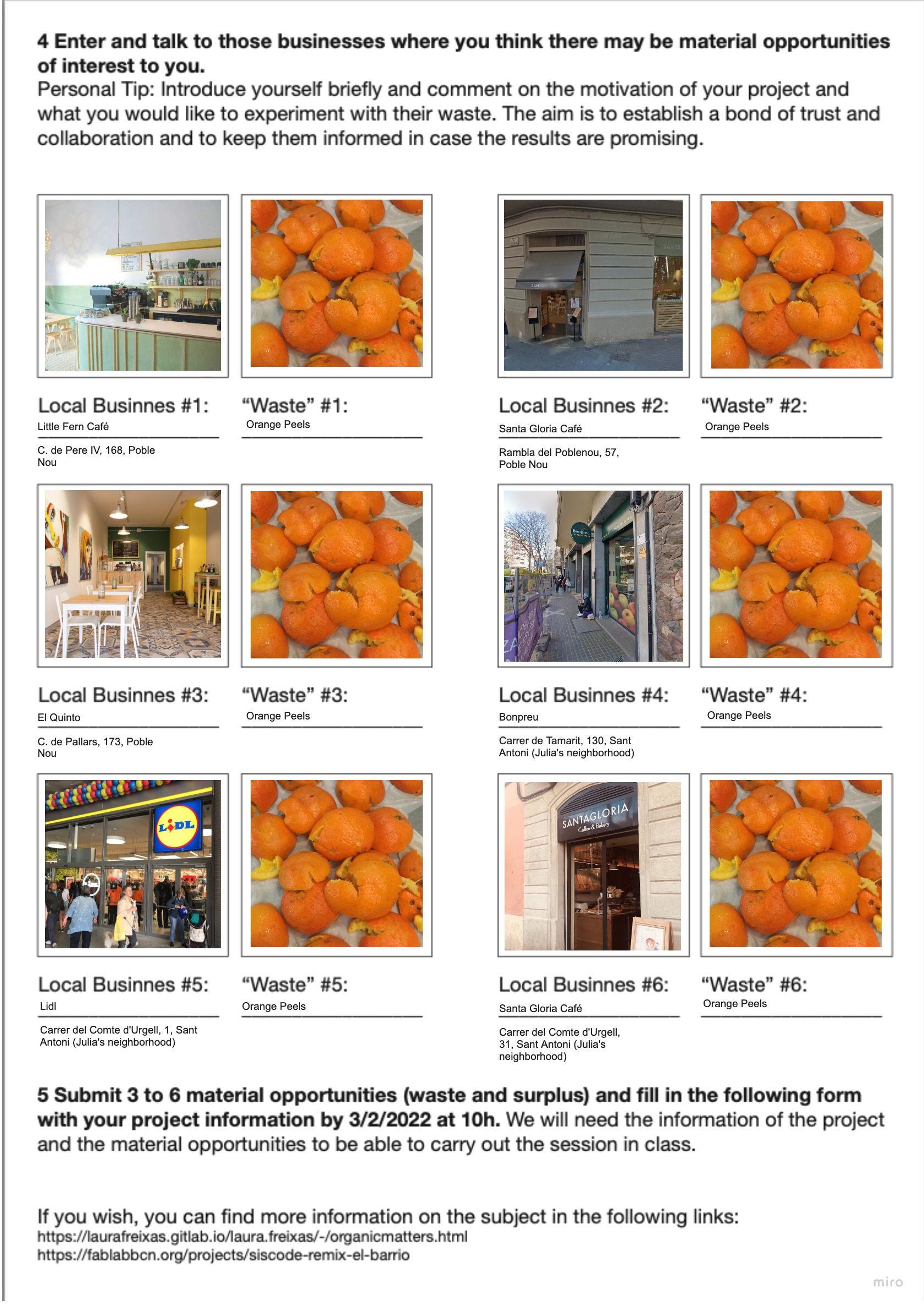 To deeper dive into biomaterials and the potentials they have in combination with community outreach, Laura Freixas introduced us to Remis El Barrio and the principles of creating a circular economy in the neighborhood. In the following two weeks we dove into exploring gathering resources (oranges) from these local stakeholders (small businesses) to manufacture material samples that could further be feasible to be manufactured as plates and bowls for serving food.