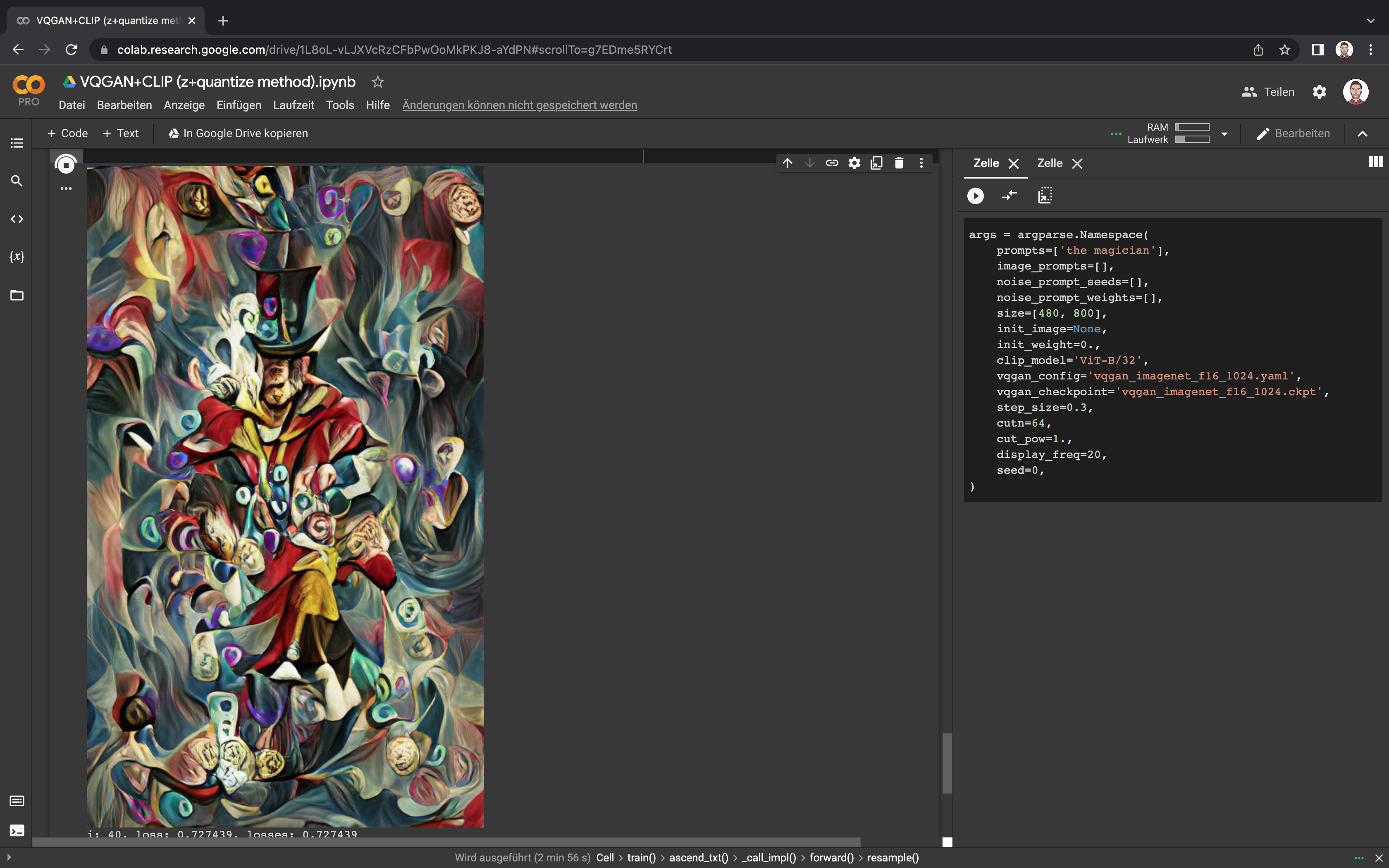 For the technical foundation, I used VQGAN+CLIP by Katherine Crowson (GitHub, Twitter), executed on Google Colab. The original BigGAN+CLIP method was by advadnoun. Tweaking settings like the initial weights, the step size, the iteration count and the starting seed, I slowly worked my way to settings which created desirable outcomes, both in terms of aesthetics and variety of associations found. The final result is based on the idea of 'cutting off' the image generation early, in order to preserve and amplify a dream-like ambivalence of the visuals, before the GAN iterates to something too concrete and specific.