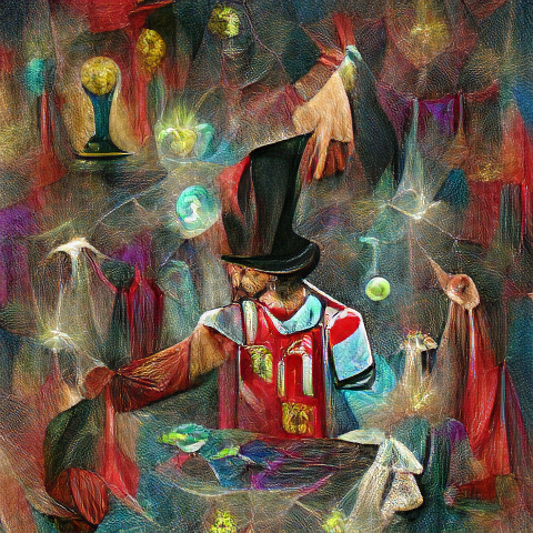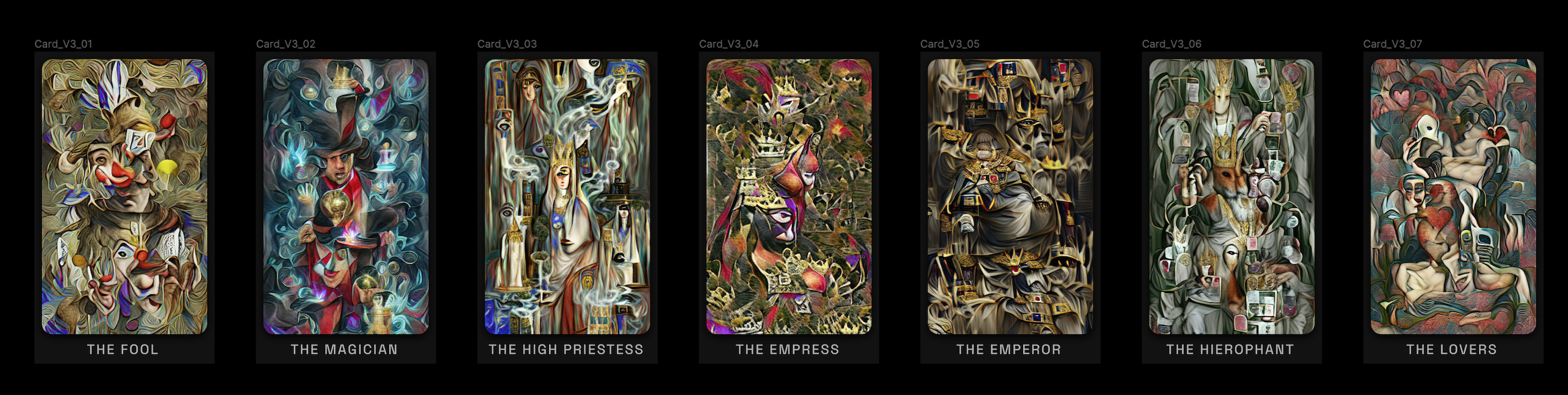 So, what if we would rethink the motives and symbols shown on each card? Better yet, what if we let an image generation network reinterpret them? A ML-network (more precisely a GAN) can use the card title (e.g. 'The Magician') as a prompt to generate an image associated with it. Consequentially, the GAN would offer its own interpretation of what the card title means in the eyes of the algorithm. In other words, this means offering its very own set of associations with the meaning of the card. Ultimately, this provokes new creative connections in us as the observer, leading to a recursion of interpretations. Venturing into this recursive loop of creative associations was the goal of this project.