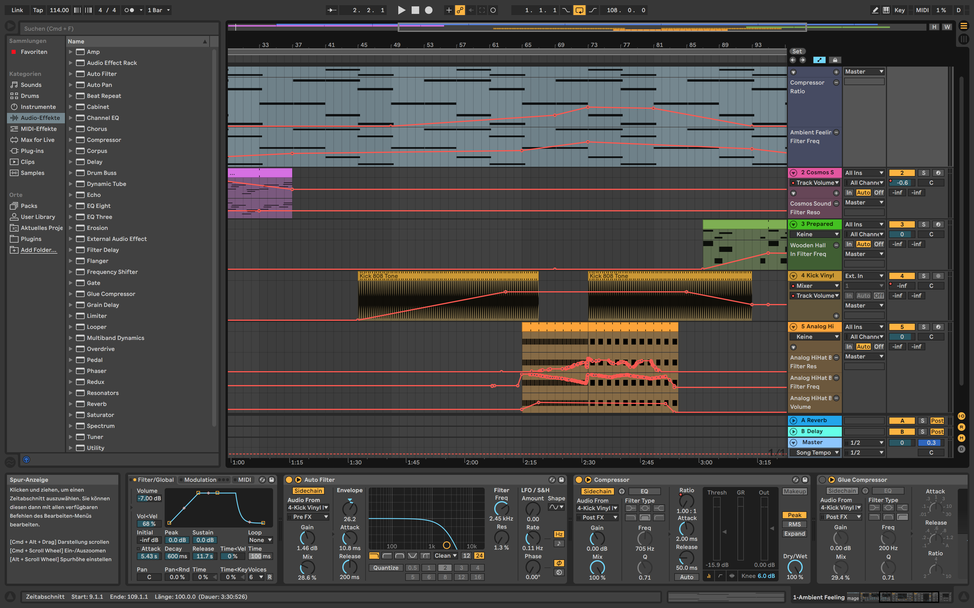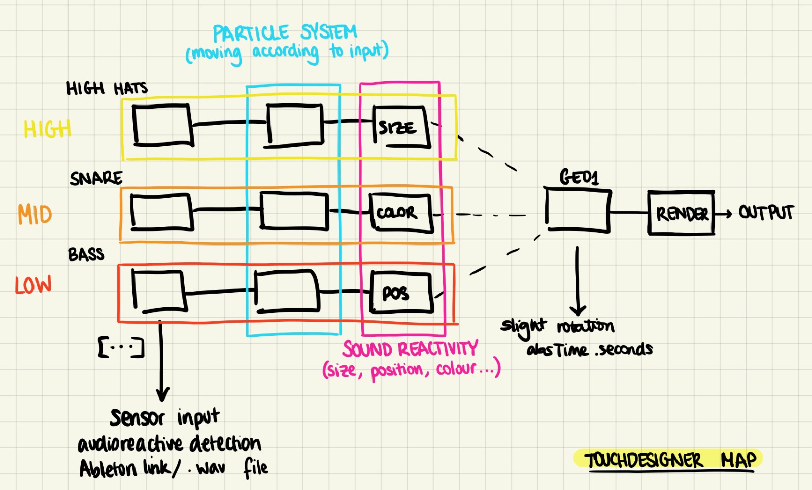 Subsequently I produced a four-minute track in Ableton Live to serve as a basis for creative experimentation. The melodies were largely generated by a ML-network using the Magenta plug-in (based on Tensorflow), while arrangement and effects were done by me. Through the sound design, I was trying to capture the emotional narrative of a clear serene night that slowly drifts into something more sinister and unsettling as the stars start to move around in the animation. After sending this rough draft over to Tatjana, she used it as a basis for building a proof-of-concept in Touchdesigner, separating high, middle and low frequencies to map it to different properties of instanced particles to be manipulated. More on the details of the concept and technicalities below.