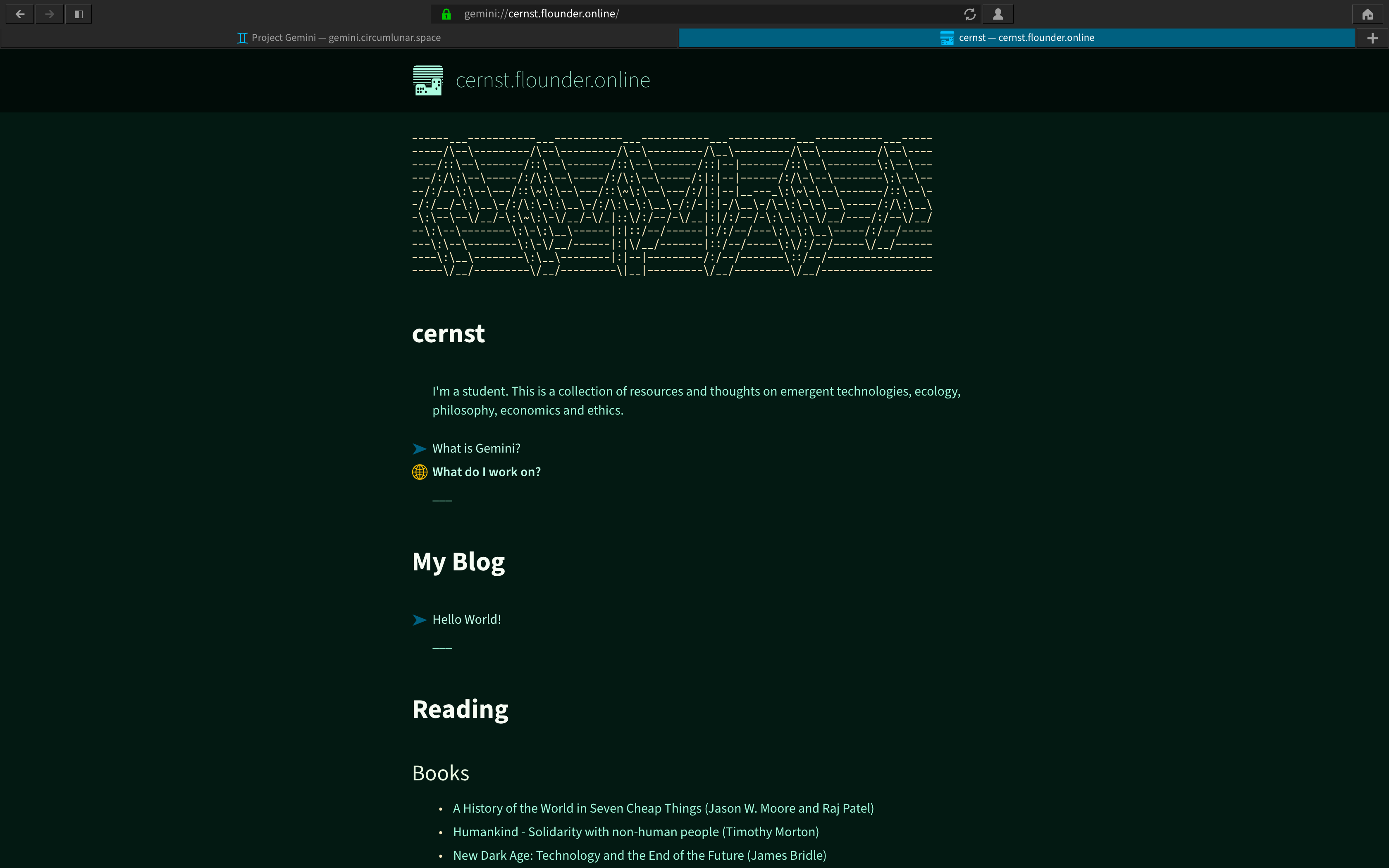 I decided to try out the Gemini protocol by setting up my own capsule (similar to a webpage). For that I used the free hosting service / community Flounder, which also offers an automatic HTTP-proxy of its sites. The site can be found in the geminispace at gemini://cernst.flounder.online/ and in HTTP under http://www.cernst.flounder.online. I have moved all of my important links and references there, to serve as a browser-independent bookmark list for me and for others. My next step is trying to host my own capsule on a gemini server running on the Raspberry Pi Zero.