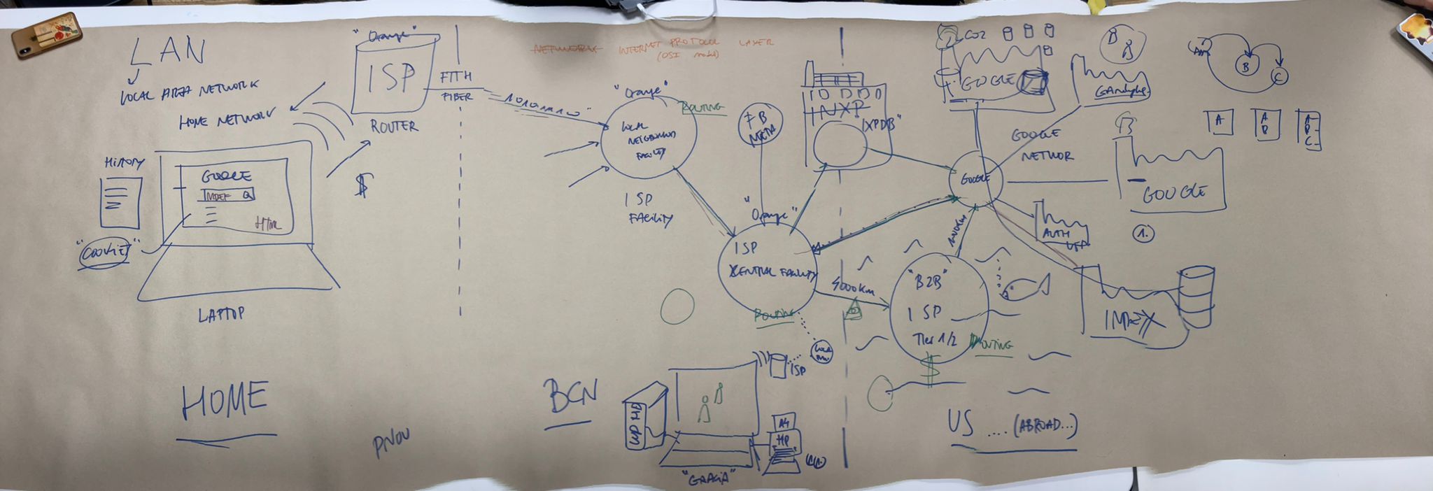 For the last part of the first class, we mapped out the topology of the modern web by retracing a Google search request through the network of ISPs, underwater cables and data centers, all the way to California, US and back.