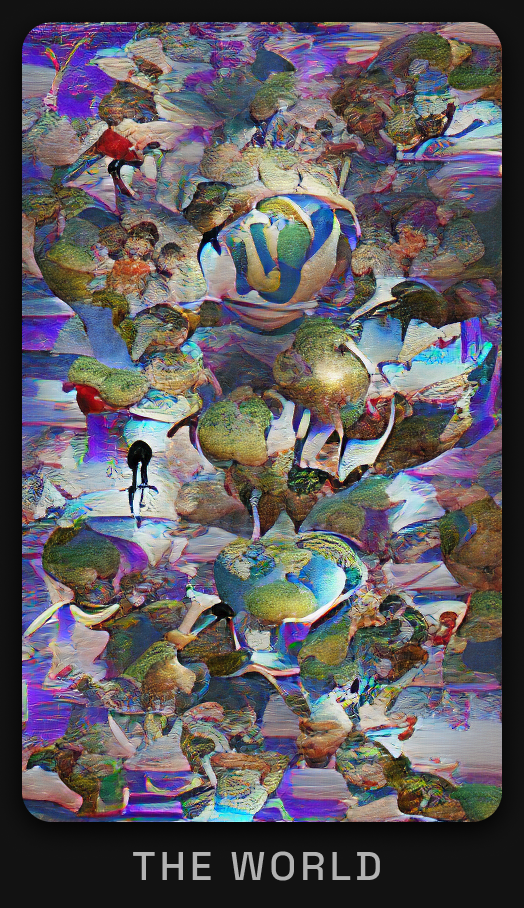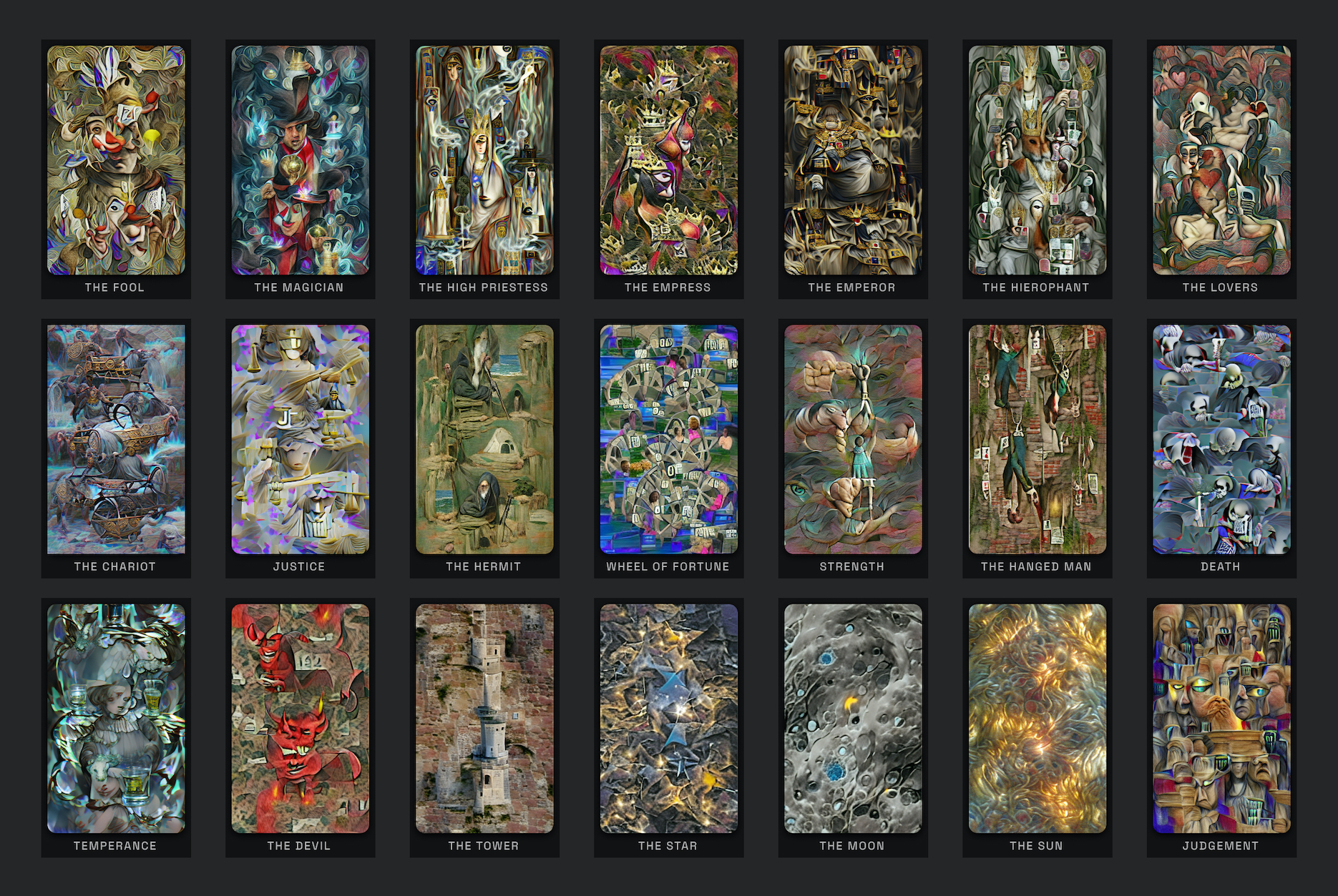 Continuing on the Deep Tarot project, I went on to generate the full 22 cards of the Major Arcana deck, which includes the most prolific cards of each Tarot deck. The methodology is documented here. After finishing the 22 cards, I reached out to JPG.store in order to mint a digital collection of these cards. I also reached out to printers to manufacture a small run of physical copies.
