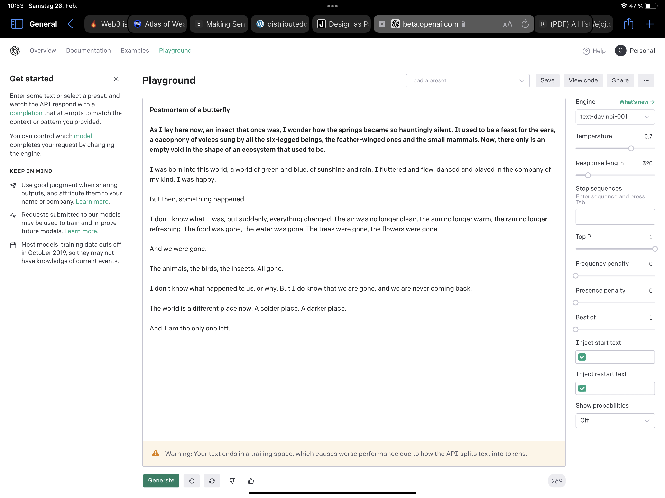 It began with hearing a podcast (thanks to Jonathan Minchin!) that follows the wildlife sound recordist Chris Watson capturing natural sounds made by plants and animals for BBC's new nature documentary series 'Green Planet'. This was further expanded by the observations of Bernie Krause, a musician and soundscape ecologist recording the sounds of natural environments for more than thirty years. In a documentary shown to us by Jose Luis de Vicente, Krause compares audio recordings from the rainforest in 90s Costa Rica to recordings from the same place in the 2010s. The difference is striking: While one recording is a rich cacophony of animals, the most recent one was almost completely silent. Pointing to the current 6th mass extinction caused by dramatic human intrusion into natural ecosystems, he contextualizes these recordings as evidence of a disaster unfolding in real time. He also used the term 'silent spring' (originally coined by Rachel Louise Carson in her 1962 book 'Silent Spring') to describe the eerie experience of witnessing the busiest season for insects - the spring - being almost completely quiet in many places on the northern hemisphere. This inspired me to experiment with writing prose in collaboration with GPT-3 to explore the topic further from the perspective of one such insect.